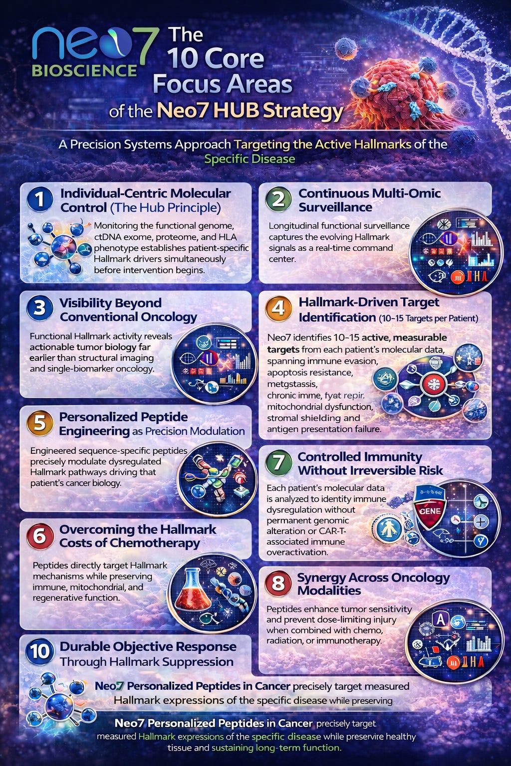 Neo7 operates as a molecular control hub, not a drug and not a fixed protocol. It is architected around the individual patient, using integrated, longitudinal surveillance to establish biological order from the outset. By anchoring therapy to the patient’s functional genome, ctDNA exome, proteome, and HLA phenotype, Neo7 defines the active Hallmark expressions of the specific disease before intervention begins. This ensures that immune defense, tumor suppression, and tissue regulation are aligned to the individual’s true cancer biology—not population averages.