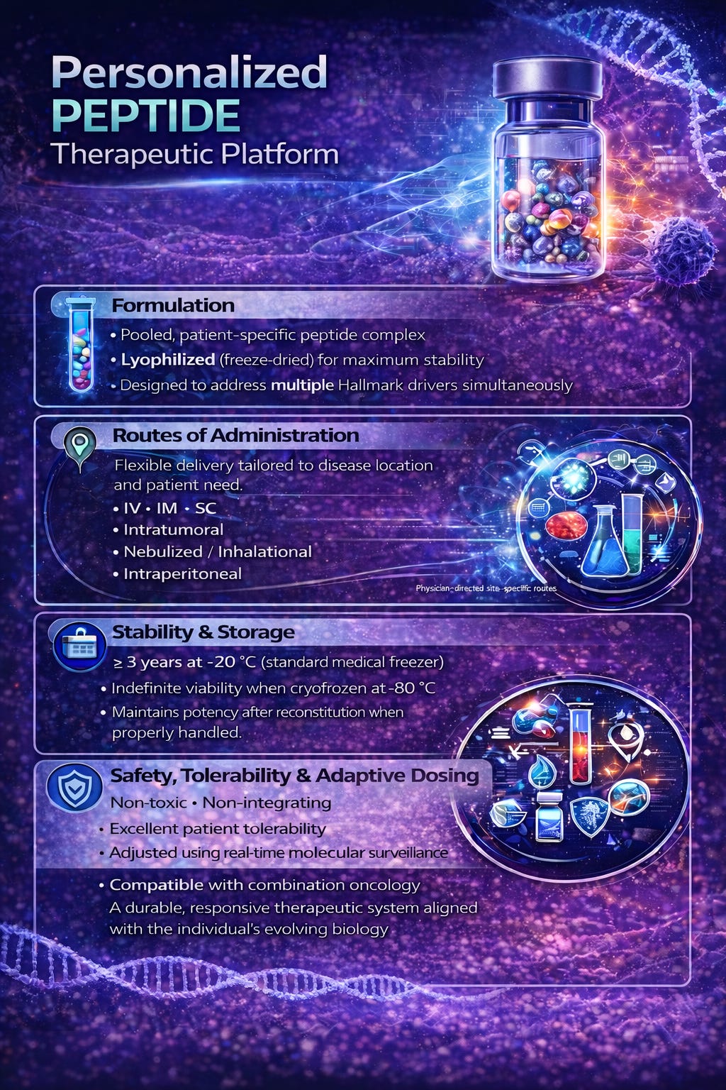 Together, pooled personalization, flexible administration, long-term stability, and adaptive dosing make Neo7 peptide therapeutics uniquely suited for chronic cancer control, combination therapy, and long-term survivorship. This is not a one-time intervention—it is a durable, responsive therapeutic system aligned with the individual's evolving biology.